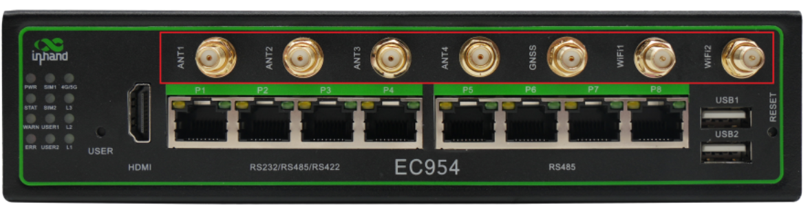 EC954共有7个天线接口,不同型号标配的天线数量不同,将天线拧入相应的天线接口完成天线安装。