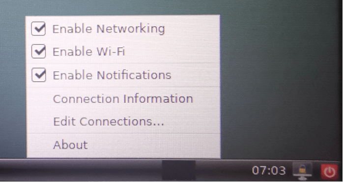 在桌面右下方右键点击红圈处 ,选择<Enable Wi-Fi>,开启WiFi,如图3-4-1所示。