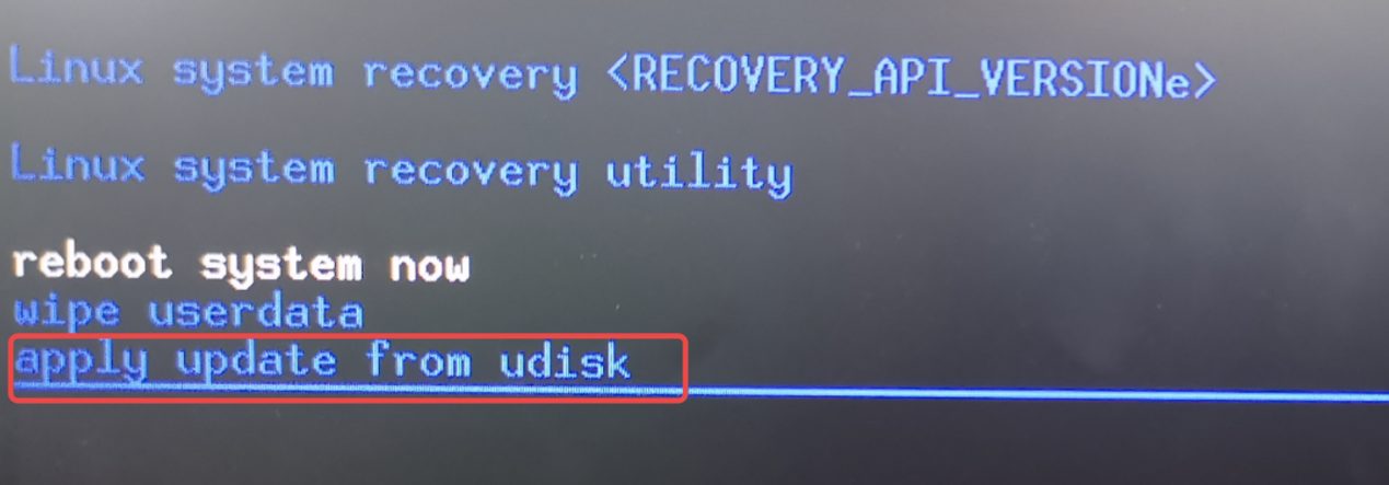 将待升级镜像文件(文件名必须为update.img)放在U盘根目录,插入设备并进入到Recovery模式(参考3.10MODE按键部分),选择< apply update from udisk> 并执行后续操作,如图3-1。此方法主要在系统固件过大或Debian系统无法启动的情况下使用。
