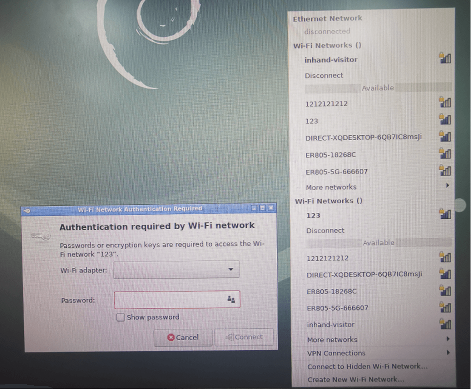 左键点击相同位置,就会显示WIFI列表,在WiFi列表中会自动扫描到周围WiFi网络的SSID和安全性设置(开放网络或者WPA/WPA2保护),选择其中一个WiFi网络,进行连接。当选择加密型网络时,会自动弹出输入密码对话框,输入密码,点击连接。如图3-4-2所示。