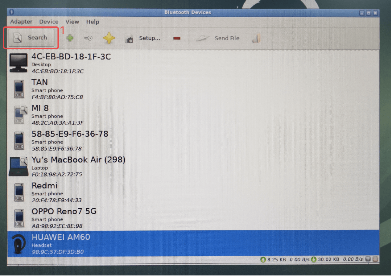 点击桌面左下角图标,点击“Preferences>>Bluetooth Manager”,打开蓝牙连接界面“Bluetooth Devices”,点击<Search>搜索附近蓝牙设备,如图3-6-1标记1处所示。