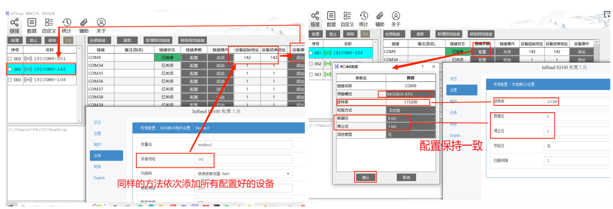 使用MThings连接设备:下载MODBUS调试工具,本次示例中采用软件为MThings,客户可自行网上搜索下载,或使用其他任意调试工具。部分参数应与IG100配置工具中的参数保持一致,添加设备的具体步骤如下图所示。