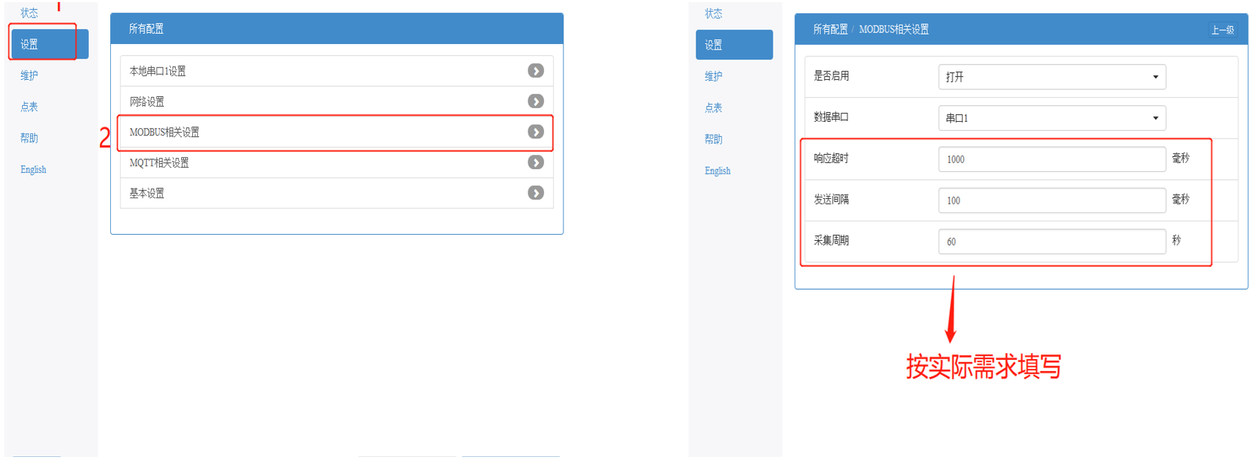 打开“网络设置>>MODBUS相关设置”进行参数修改即可。默认关闭MODBUS功能,需手动点击“打开”后方可进行后续配置。具体参数说明如下: